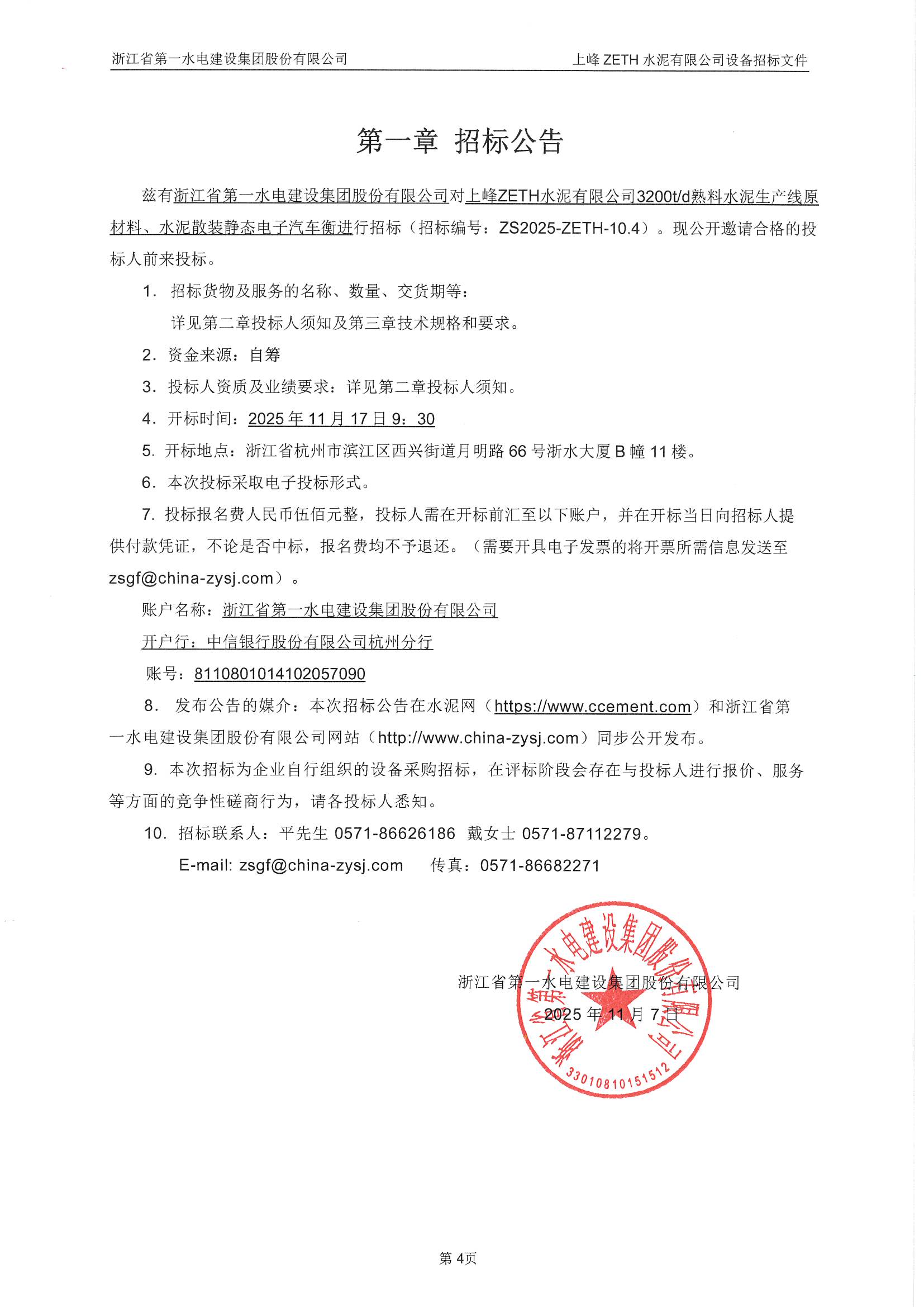 上峰ZETH水泥有限公司3200t/d熟料水泥生產(chǎn)線原材料、水泥散裝靜態(tài)電子汽車(chē)衡招標(biāo)公告