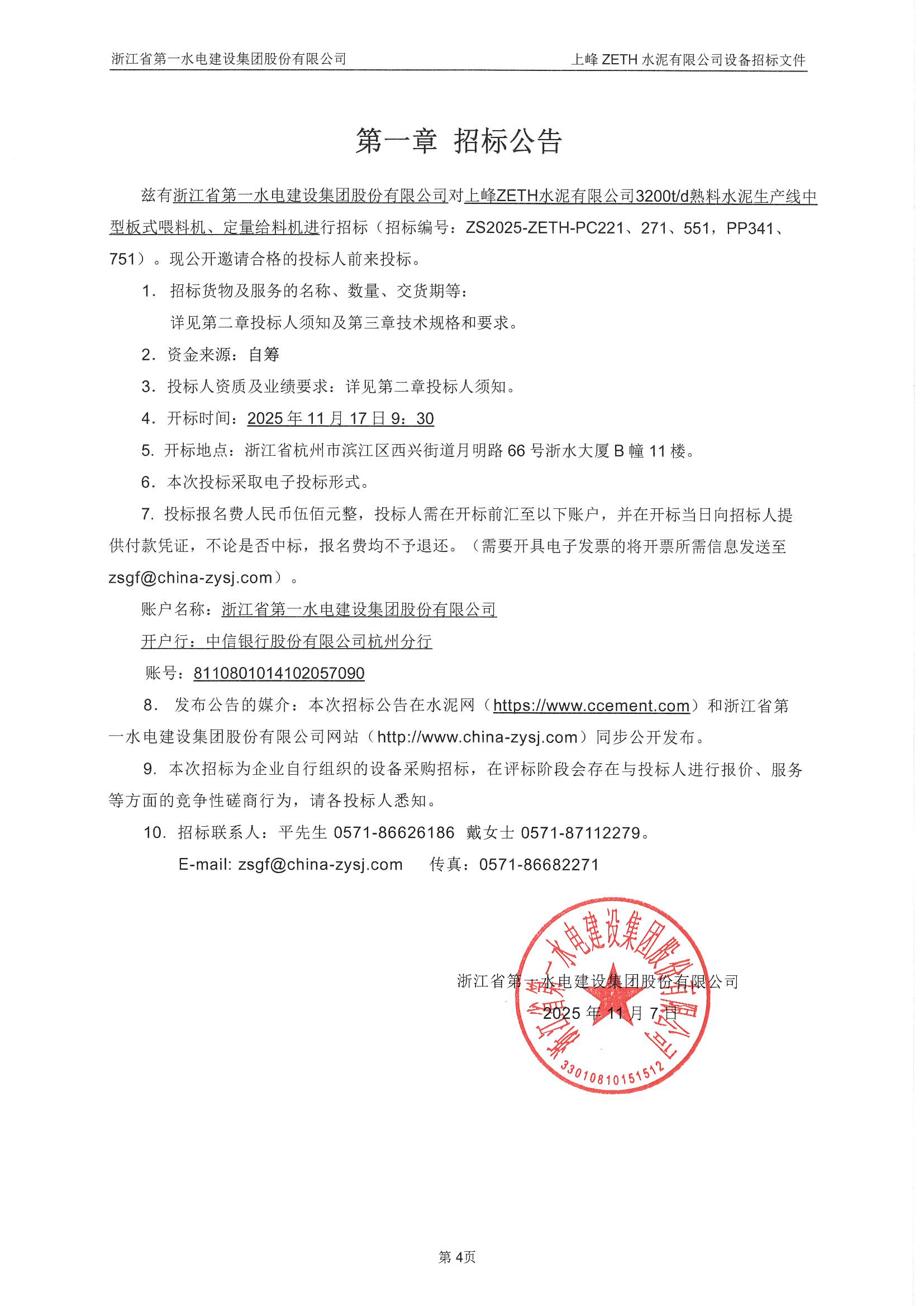 上峰ZETH水泥有限公司3200t/d熟料水泥生產(chǎn)線中型板式喂料機(jī)、定量給料機(jī)招標(biāo)公告